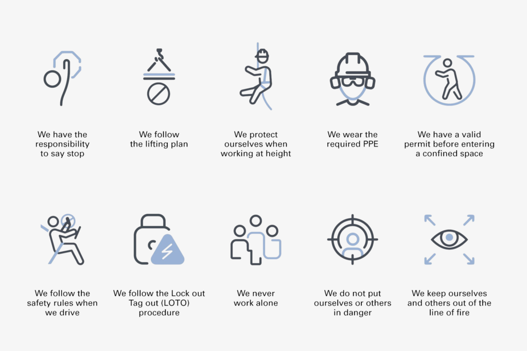 Zur Vermeidung schwerer Verletzungen und zur Adressierung der zentralen Risiken in unseren Tätigkeiten haben wir zehn lebensrettende Regeln eingeführt. Sie definieren verbindliche, nicht verhandelbare Mindeststandards und gelten jederzeit für alle Mitarbeitenden, Subunternehmer und Geschäftspartner.