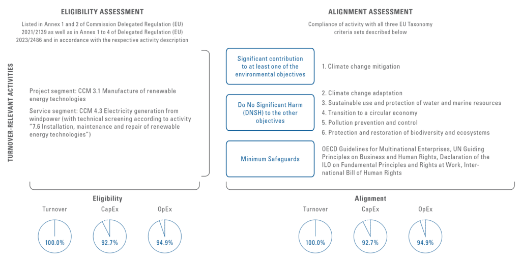 Having adequate processes and procedures in place to ensure compliance with the requirements of the Minimum Safeguards, we did not identify a violation of them for any of our activities. Furthermore, our turnover-relevant activities “Manufacture of Renewable Energy Technologies (3.1)” and “Electricity generation from wind power” (4.3) both meet the applicable Technical Screening criteria (Substantial Contribution and DNSH criteria) and are hence considered Taxonomy-aligned.