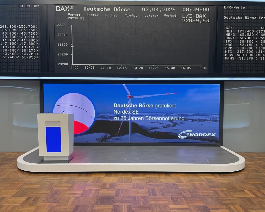 Hoy celebramos un hito muy especial en Nordex Group: Han pasado 25 años desde que Nordex SE cotizó por primera vez en la Bolsa de Frankfurt. Desde su salida al Neuer Markt el 2 de abril de 2001, Nordex ha pasado de ser un pionero audaz de la energía eólica a convertirse en uno de los principales proveedores mundiales de aerogeneradores. Nuestra salida a bolsa, con 32,9 millones de acciones colocadas a 9 euros, sentó las bases económicas para el crecimiento a largo plazo de la empresa.
