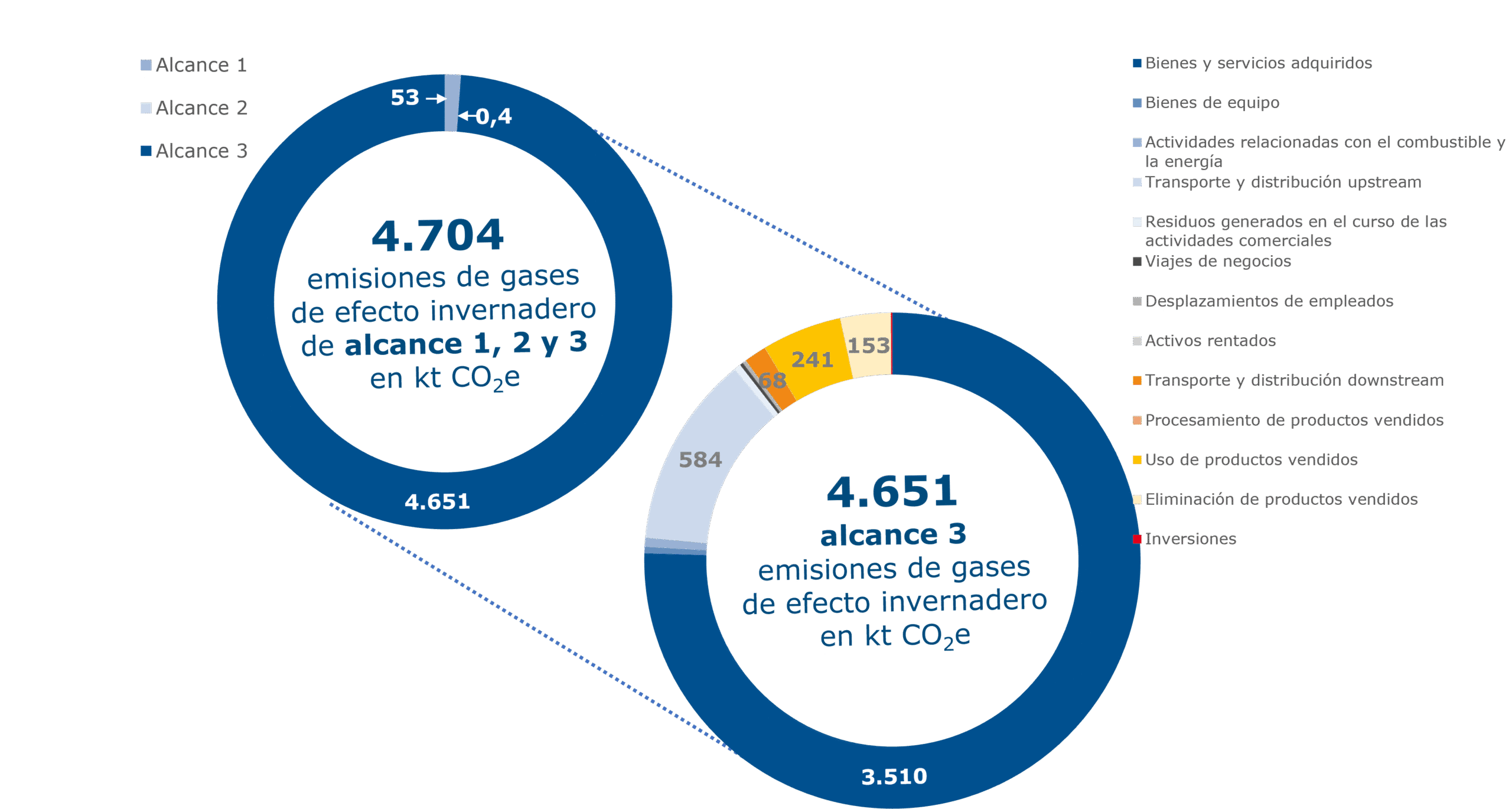 En el marco de dicho análisis, se han clasificado las fuentes de emisión de GEI y se han establecido las siguientes categorías comunes: todas las emisiones directas (Alcance 1); las emisiones indirectas generadas al crear la energía adquirida (Alcance 2); y todas las emisiones en la cadena de valor aguas arriba y aguas abajo (Alcance 3).